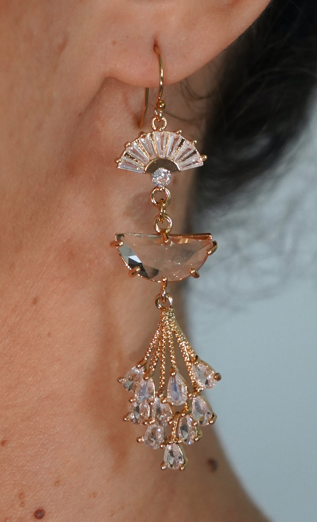 These stunning gold statement earrings are inspired by delicate snowdrop flowers and the elegant 1920s art deco style, they feature 14K gold filled ear wires and shimmering cubic zirconia stones set in gold-plated settings.