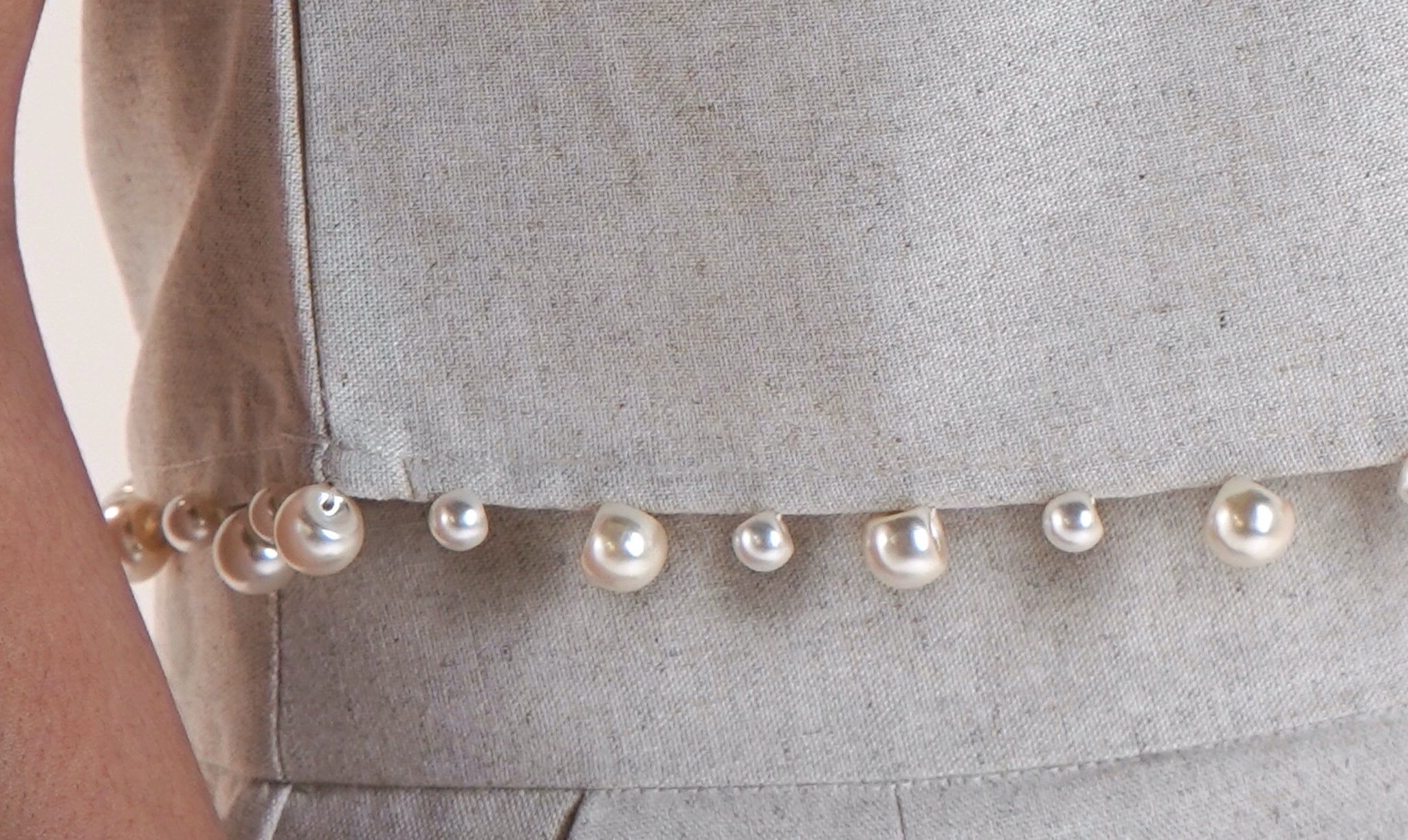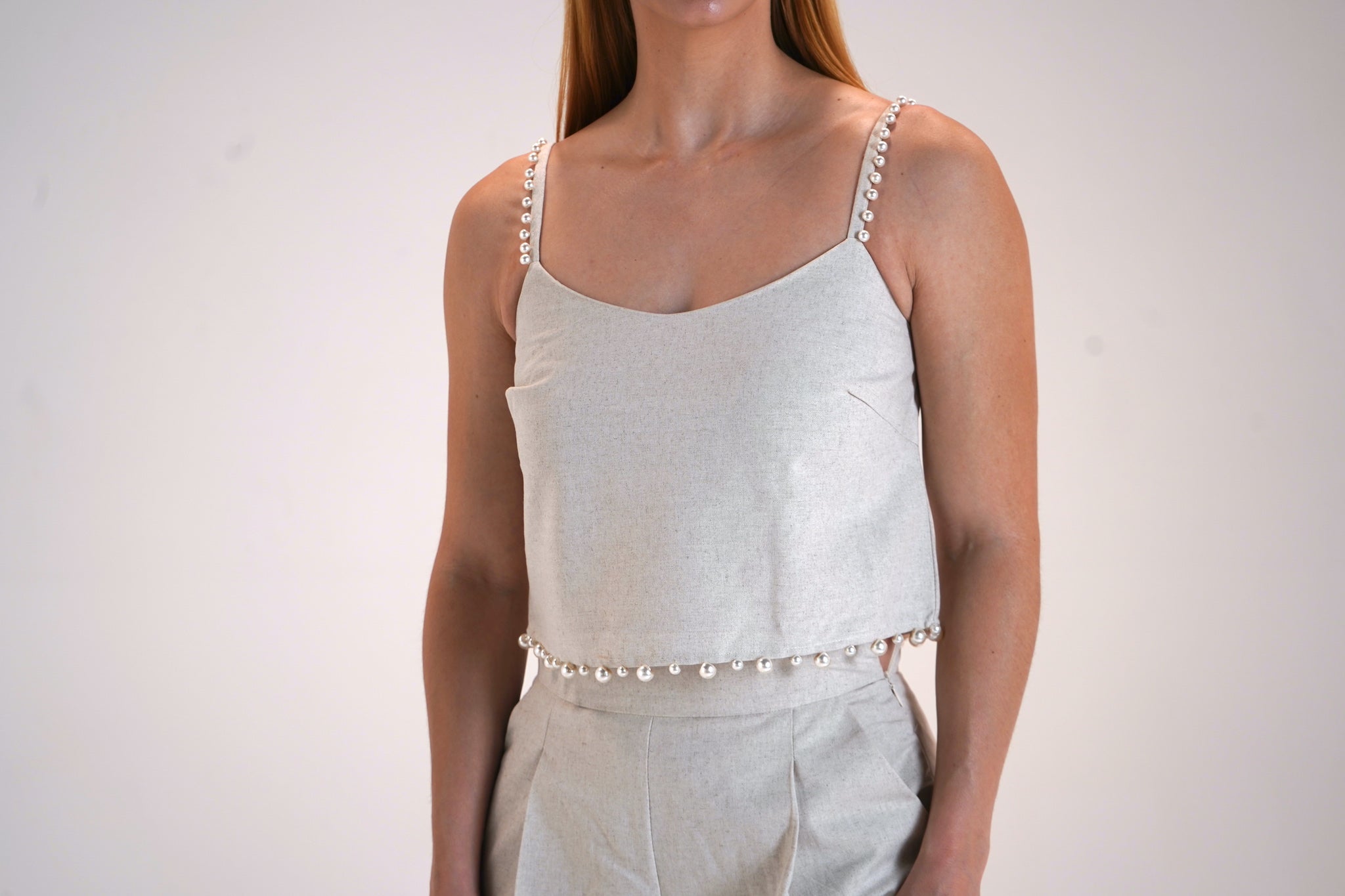 This chic crop top is made from a breathable natural linen blend that keeps you comfortable. Pearl details along the straps and hem add a subtle, feminine touch. With a square neckline and relaxed fit, it pairs effortlessly with high-waisted trousers or your favorite jeans for a casual, stylish look.